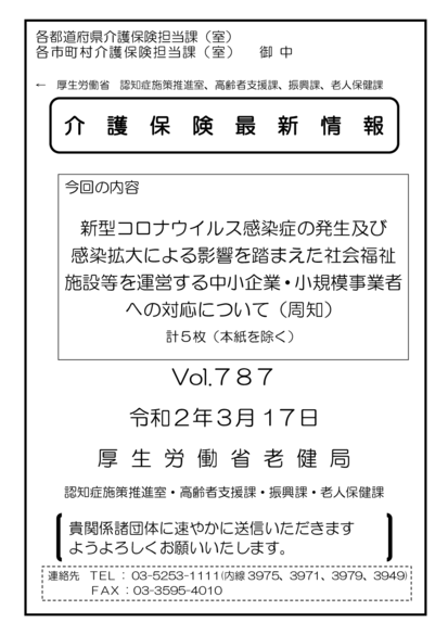 【厚生労働省】「新型コロナウイルス感染症の発生及び感染拡大による影響を踏まえた社会福祉施設等を運営する中小企業・小規模事業者への対応について(周知)」(令和2年3月17日付事務連絡)(介護保険最新情報vol.787)