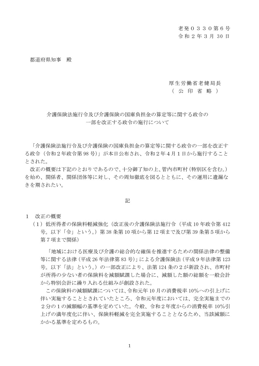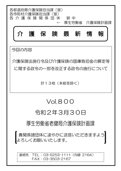 ・介護保険法施行令及び介護保険の国庫負担金の算定等に関する政令の一部を改正する政令の施行について(令和2年3月31日付)(介護保険最新情報vol.800)