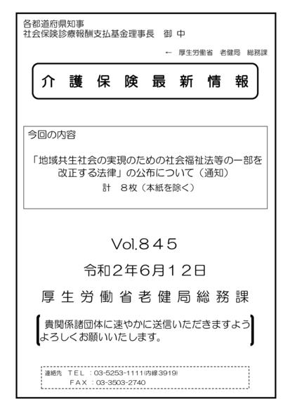 厚生労働省より、「「地域共生社会の実現のための社会福祉法等の一部を改正する法律」の公布について(通知)(介護保険最新情報vol.845)」について、周知依頼がありましたのでご案内いたします。