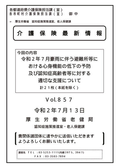 ・令和2年7月豪雨に伴う避難所等における心身機能の低下の予防及び認知症高齢者等に対する適切な支援について(令和2年7月13日付事務連絡)(介護保険最新情報Vol.857)