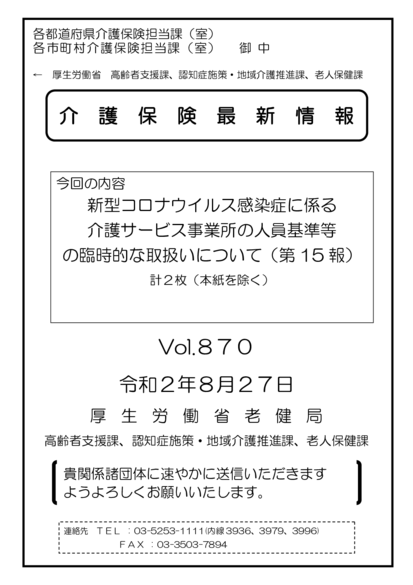 ・「新型コロナウイルス感染症に係る介護サービス事業所の人員基準等の臨時的な取扱いについて(第15 報)」(令和2年8月27日付事務連絡)(介護保険最新情報vol.870)