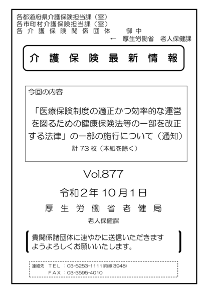 ・「「医療保険制度の適正かつ効率的な運営を図るための健康保険法等の一部を改正する法律」の一部の施行について(通知)」(令和2年10月1日付老発1001第2号)(介護保険最新情報Vol.877)