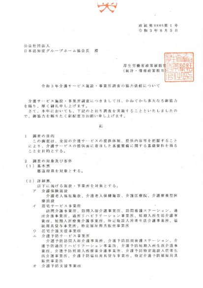 厚生労働省より、令和3年度介護サービス施設・事業所調査の協力依頼について、当協会宛てに協力依頼がありましたのでご案内いたします。