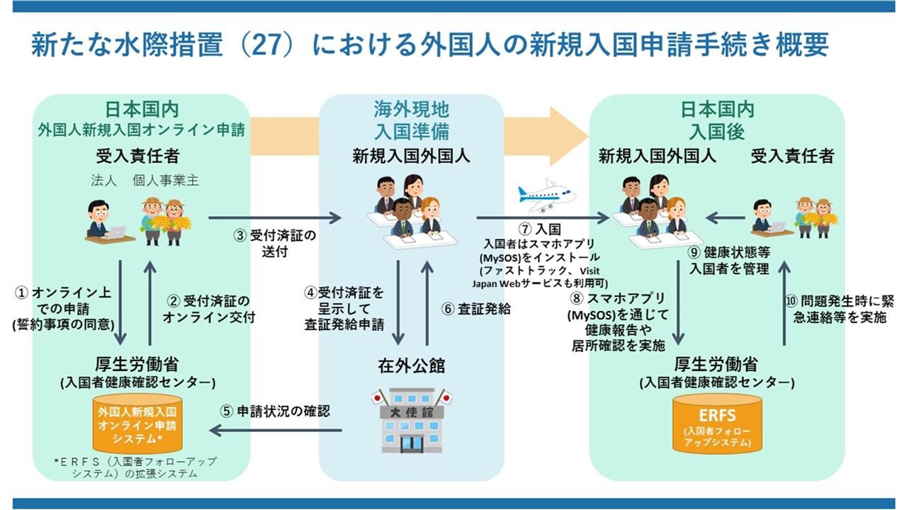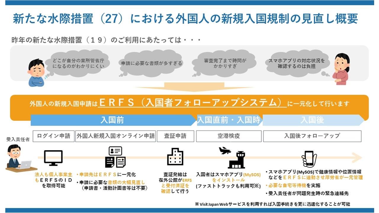 まずは、受入責任者が、厚生労働省の入国者健康確認システム(ERFS) (2月25日午前10時より受付開始) に事前申請する必要があります。