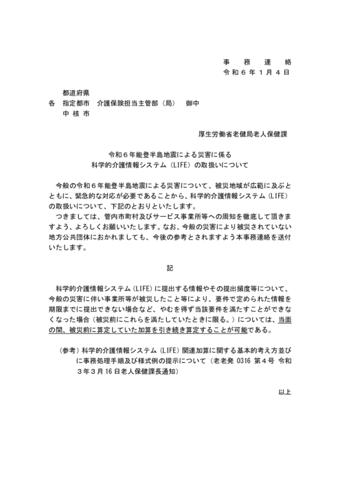 ・(事務連絡)令和6年能登半島地震による災害に係る科学的介護情報システム(LIFE)の取扱いについて(主管部(局)宛て)
