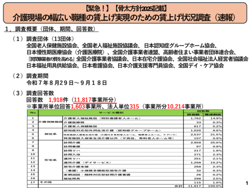 先般、会員の皆さまにご協力いただきました「【緊急!】【骨太方針2025記載】介護現場の幅広い職種の賃上げ実現のための賃上げ状況調査」につきまして、調査結果(速報値)がまとまりましたのでご報告させていただきます。