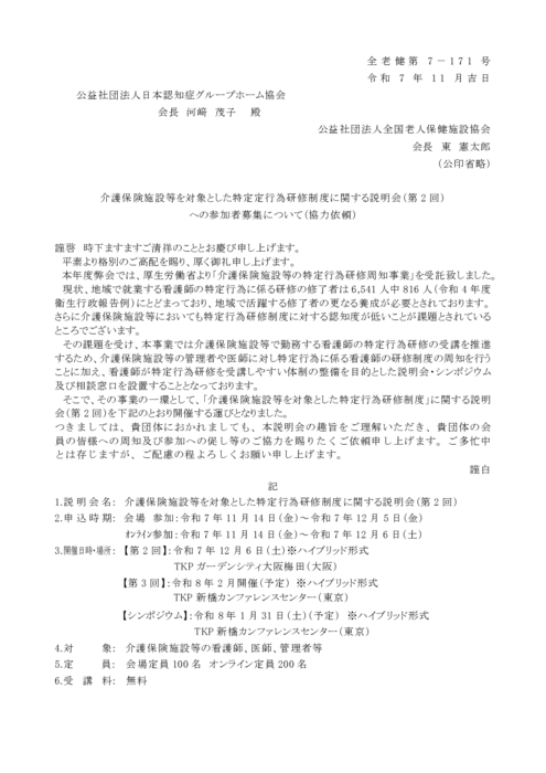 ・介護保険施設等を対象とした特定定行為研修制度に関する説明会(第2回)への参加者募集について(協力依頼・当協会宛て)