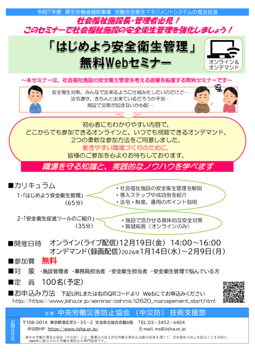 ●社会福祉施設向け「はじめよう安全衛生管理」無料Webセミナー