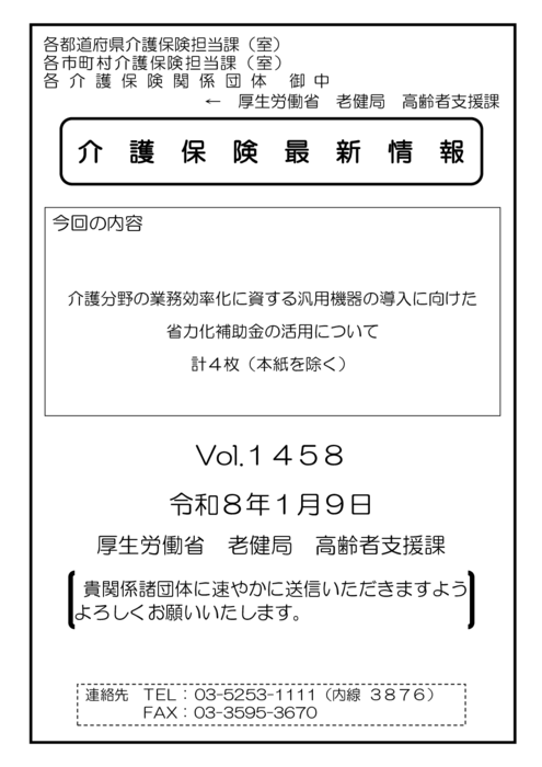 厚生労働省より、介護分野の業務効率化に資する汎用機器の導入に向けた省力化補助金の活用について(介護保険最新情報Vol.1458)について、周知依頼がありましたのでご案内いたします。