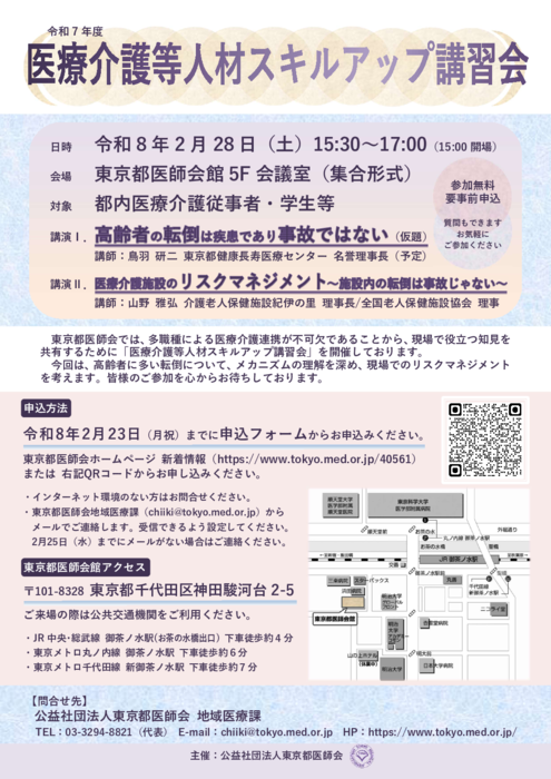 東京都医師会より、令和7年度「医療介護等人材スキルアップ講習会」(2月28日開催)について、周知依頼がありましたのでご案内いたします。