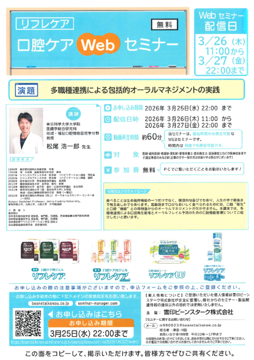 【雪印ビーンスターク株式会社】リフレケア 口腔ケアWebセミナーのご案内(2026年3月26日~27日配信)