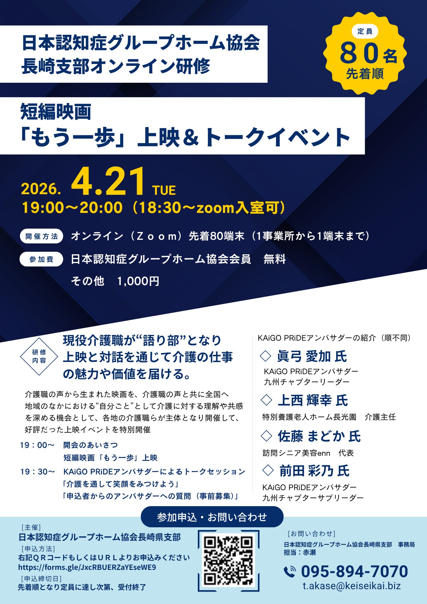 長崎県支部では、令和8年4月21日(火)、短編映画「もう一歩」上映&トークイベント (オンライン研修) を開催するのでご案内いたします。