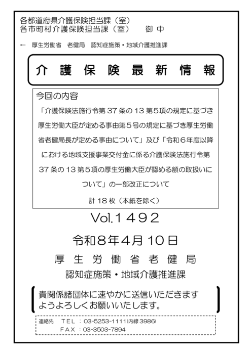 厚生労働省より、「「介護保険法施行令第37条の13第5項の規定に基づき厚生労働大臣が定める事由第5号の規定に基づき厚生労働省老健局長が定める事由について」及び「令和6年度以降における地域支援事業交付金に係る介護保険法施行令第37条の13第5項の厚生労働大臣が認める額の取扱いについて」の一部改正について」(介護保険最新情報Vol.1492)について、周知依頼がありましたのでご案内いたします。