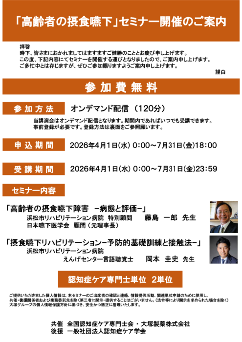 大塚製薬株式会社より、「高齢者の摂食嚥下」セミナー(オンデマンド配信)の開催について周知依頼がありましたのでご案内いたします。