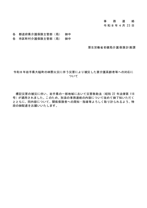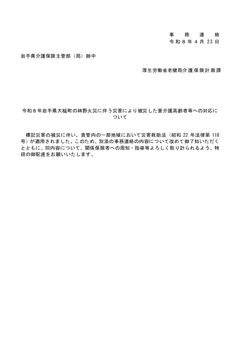 ・【事務連絡①】令和8年岩手県大槌町の林野火災に伴う災害により被災した要介護高齢者等への対応について
