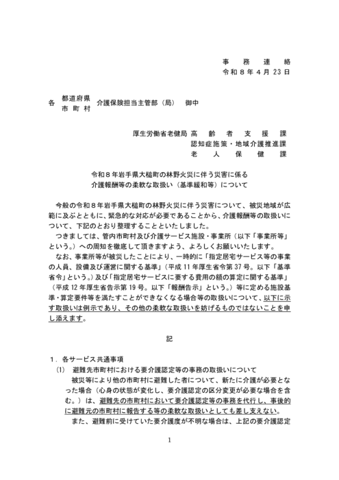 ・【事務連絡】令和8年岩手県大槌町の林野火災に伴う災害に係る介護報酬等の柔軟な取扱い(基準緩和等)について