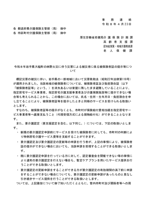 厚生労働省より、令和8年岩手県大槌町の林野火災に伴う災害にかかる介護報酬等の柔軟な取扱い(基準緩和等)と被保険者証の提示等について、周知依頼がありましたのでご案内いたします。